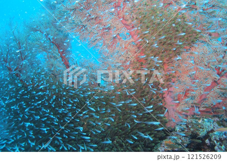 ナンヨウハギの群れと豪華な赤いイソバナの群生他 美しいサンゴ礁と熱帯魚の群れ。 沖縄県島尻郡慶良間諸