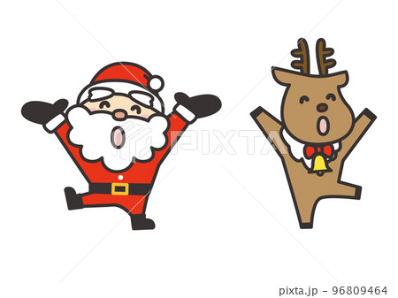 バンザイする陽気なサンタさんとトナカイのかわいいイラスト素材