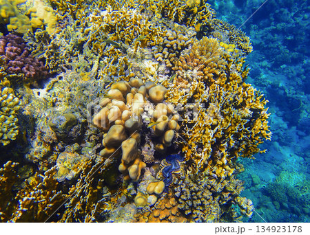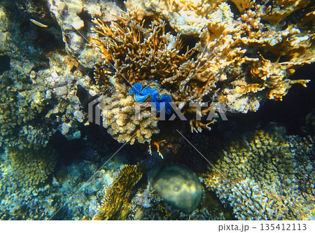 Coral reef underwater. Blue tridacna clam among acropora, millepora and platygyra colonies, tropical
