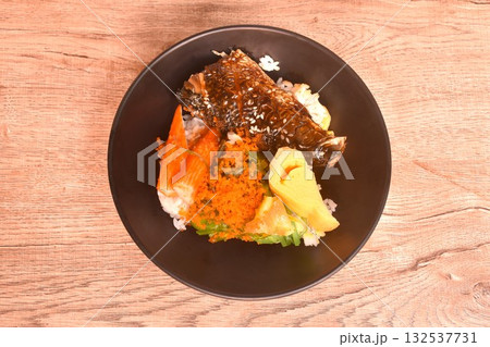 grilled saba fish or mackerel topping crab stick and shrimp egg couple sweet egg on japanese rice in bowl