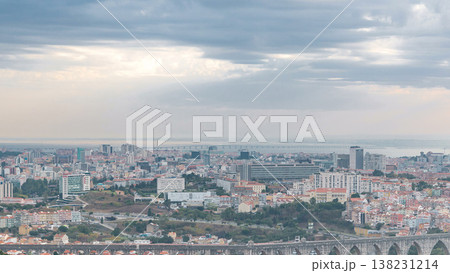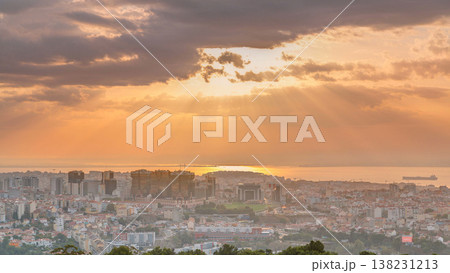 Panoramic overview during sunrise over Lisbon from a viewpoint in Monsanto morning timelapse.