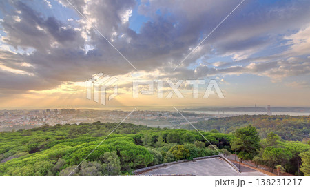 Panoramic sunrise view over Lisbon and Almada from a viewpoint in Monsanto morning timelapse.