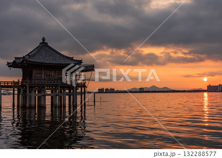 琵琶湖に浮かぶ満月寺 浮御堂の朝景