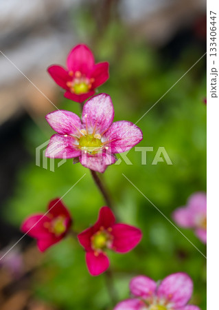 Close up of Saxifraga rosacea, Irish saxifrage. Beautiful pink spring flowers blooming in the rock garden. Gardening concept. Natural background. Selective focus, shallow depth of field