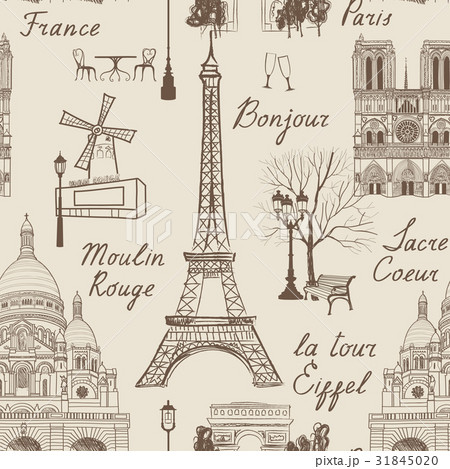 フランス、パリのイラスト(エッフェル塔、凱旋門、ファッション、美術館、可愛い、オシャレ、手書き)