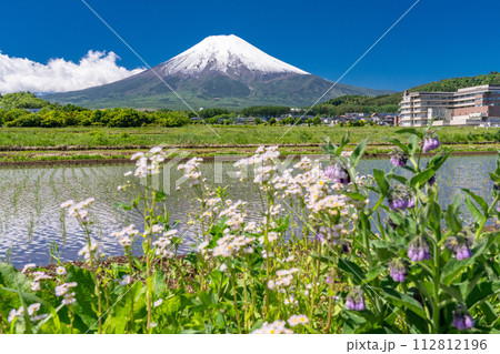 《山梨県》初夏大冠雪の富士山・新緑の富士吉田農村公園の田園風景