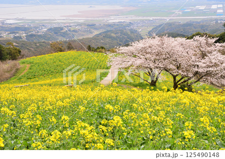 【長崎県】快晴の白木峰高原の満開の桜と菜の花畑