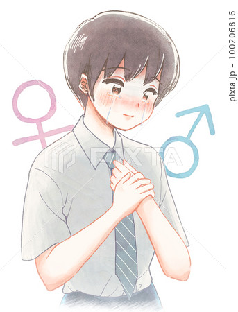 性同一性障害、性別違和、泣く学生の水彩風イラスト