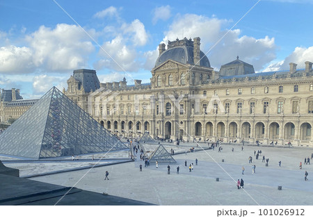パリにあるフランスの国立美術館で世界最大級の美術館であるルーヴル美術館内から見たメインの中庭の景色