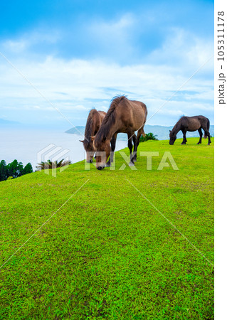 都井岬に生息する天然記念物の御崎馬が放牧地で草を食べる様子|馬イメージ|宮崎県串間市
