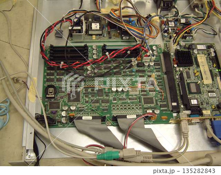 電子機器の内部に配置された複雑な基板と配線のクローズアップ。精密な電子回路と産業用システムの構造