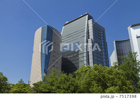 新緑の大阪城公園から見るNHK大阪放送局と大阪府警本部