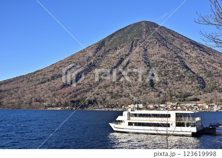 栃木県日光市 秋の紅葉に染まる阿世潟から見る男体山と中禅寺湖
