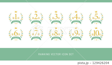 表彰のランキング用アイコンセット、1位から10位までのTOP10。ベクター、順位、ゴールド&グリーン