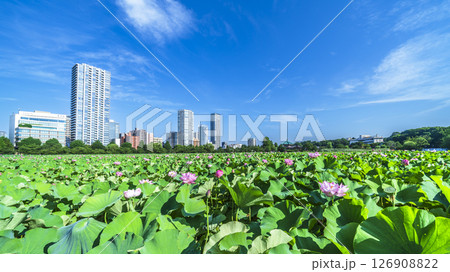夏の上野公園 不忍池の蓮の花とビル群【東京都・台東区】
