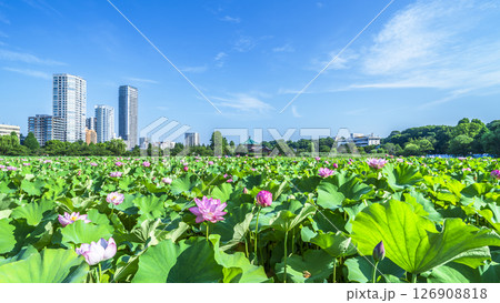 夏の上野恩賜公園 不忍池の蓮とビル群【東京都・台東区】