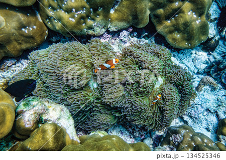 Clownfish or Anemonefish hiding in sea anemone coral on the pinnacle