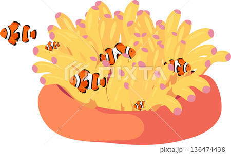 A group of clown fish are swimming in the seawater.