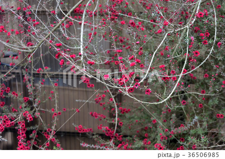 Manuka, manuka myrtle, New Zealand teatree,broom tea-tree or leptospermum scoparium plant with bright red flowers.