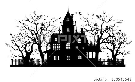 Haunted mansion silhouette with bats and trees, created AI, PNG