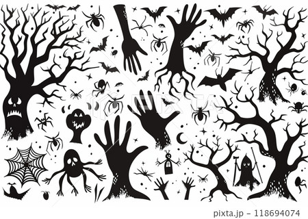 Eerie Halloween doodle art featuring spooky trees, bats, and creepy hands.