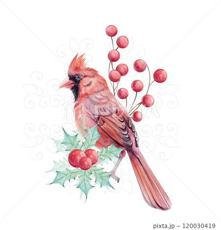 Watercolor Christmas bird red cardinal, with brunch, red berrie bouquet with holly green leaves. isolated. Symbol of Christmas. Winter holiday decoration in retro, vintage style. Hand drawn