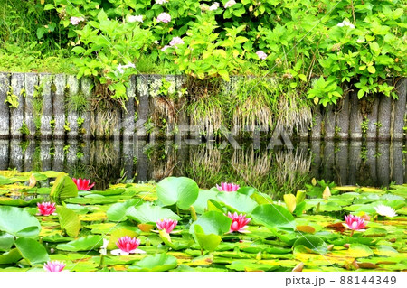 ピンク色の睡蓮の花 千町無田水田公園 大分県玖珠郡