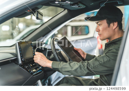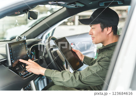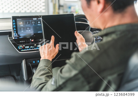 自動車の車内でタブレットを使い・メンテナンス・修理・チェック・点検する男性作業員