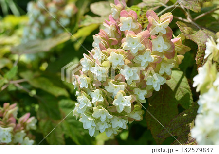 初夏の公園に咲く白い花に茶色の葉をもつカシワバアジサイ