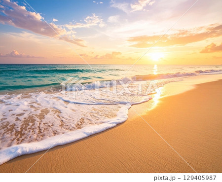 朝日に染まる砂浜と波打ち際の幻想的な風景