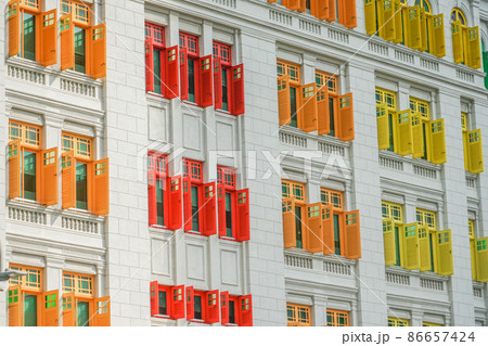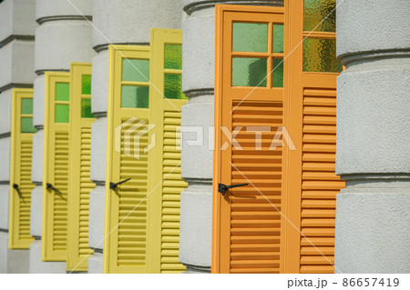 Architecture of colorful windows at Hill Street Police Station, Singapore