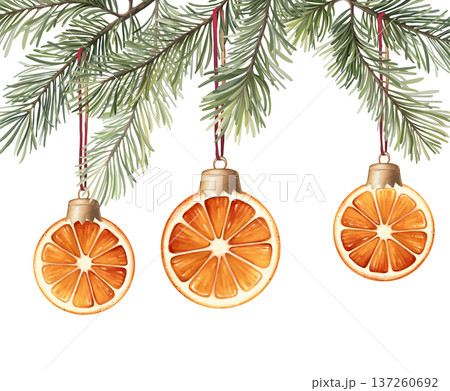 Isolated illustration featuring hand-drawn pine branches arranged with dried orange slices.