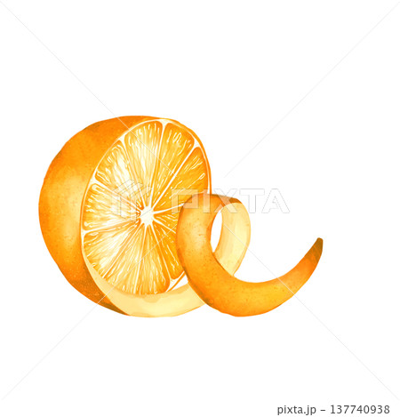 Hand drawn digital illustration of juicy orange citrus slice, twisted orange peel zest