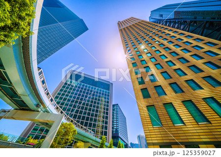 日本の東京都市景観 Wダイヤモンドの珍景…汐留のビル群などを望む(ゆりかもめの連続Pあり)