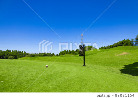青空のゴルフ場・ティーイングエリアとサイドにある林の1ペナ、ヤード表示の案内板サインの表示(千葉県木