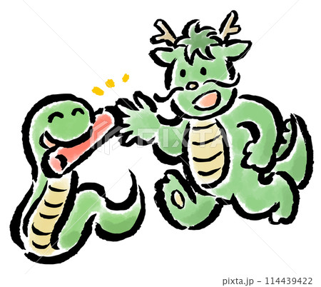 辰年から巳年へ バトンタッチする辰と巳 筆タッチイラスト