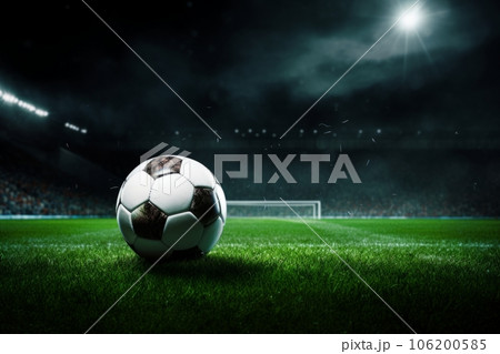 スタジアムのサッカーグラウンドに転がるボール:AI作品