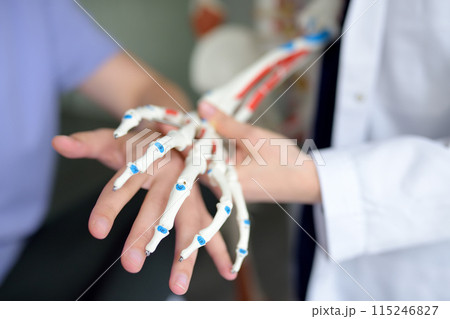 Rehab doctor is on appointment of patient in gym. PMR specialist showing skeleton of the hand and explaining the patient how joints of hand working.