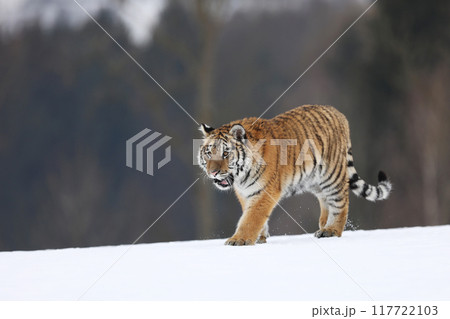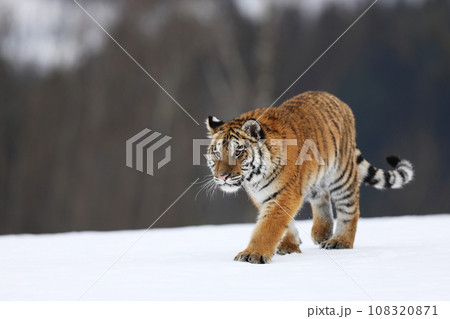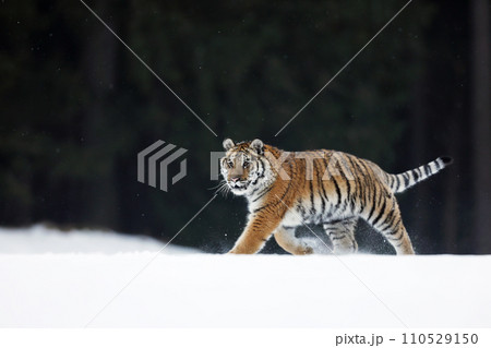 Young siberian tiger running through russian taiga in winter (Panthera tigris altaica)