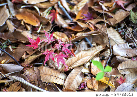 晩秋の落ち葉の中から顔を出すモミジの紅葉した新芽