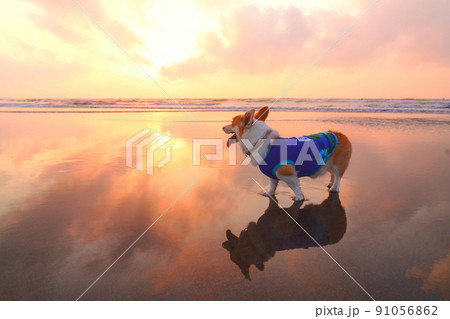 朝焼けの波打ち際を散歩するコーギー