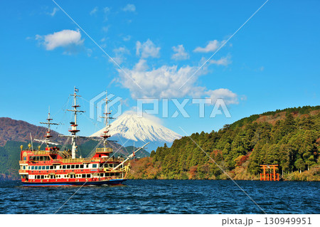 (神奈川県)秋の芦ノ湖 遊覧船と富士山