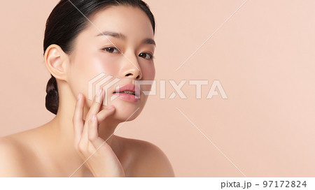 Beautiful young asian woman with clean fresh skin on beige background, Face care, Facial treatment, Cosmetology, beauty and spa, Asian women portrait.