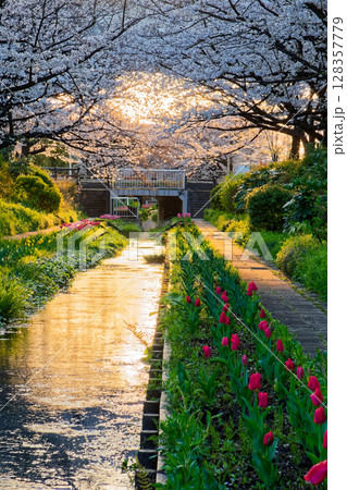 朝日差す港北ニュータウン・江川せせらぎ緑道の桜とチューリップ