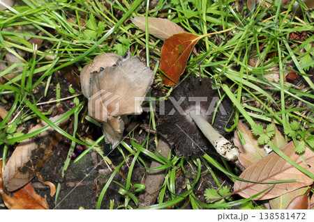 春の草地にカサが黒く溶けてはじめるヒトヨタケ茸アップ(菌・キノコ類マクロ撮影)