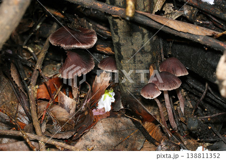 日本の春、湿潤な朽ち木林床にこげ茶色のウスベニイタチタケ茸たち(自然環境下菌・キノコ類マクロ撮影)