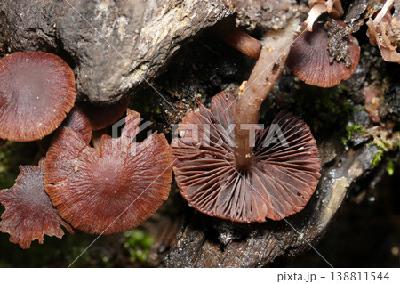 日本の春、湿潤な朽ち木林床にこげ茶色のウスベニイタチタケ茸(自然環境下菌・キノコ類マクロ撮影)