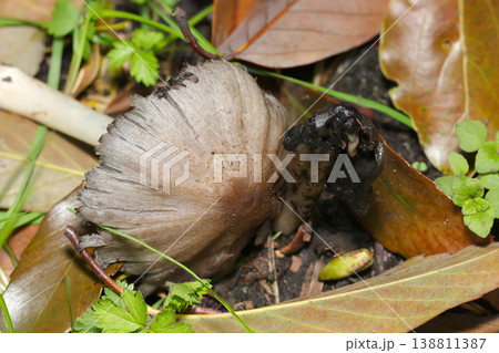 成熟したコキララタケが徐々に自己消化して黒く溶解する変化見本(自然下菌キノコ類マクロ撮影)