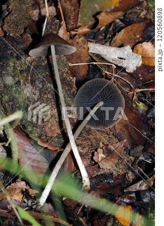 湿った雑木林の中に細い脚で立つナヨタケ(自然光+ストロボ・マクロ接写)