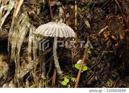 雑木林の腐葉土にうす灰色のかわいいキャップをかぶったナヨタケ(ストロボ+マクロ撮影)